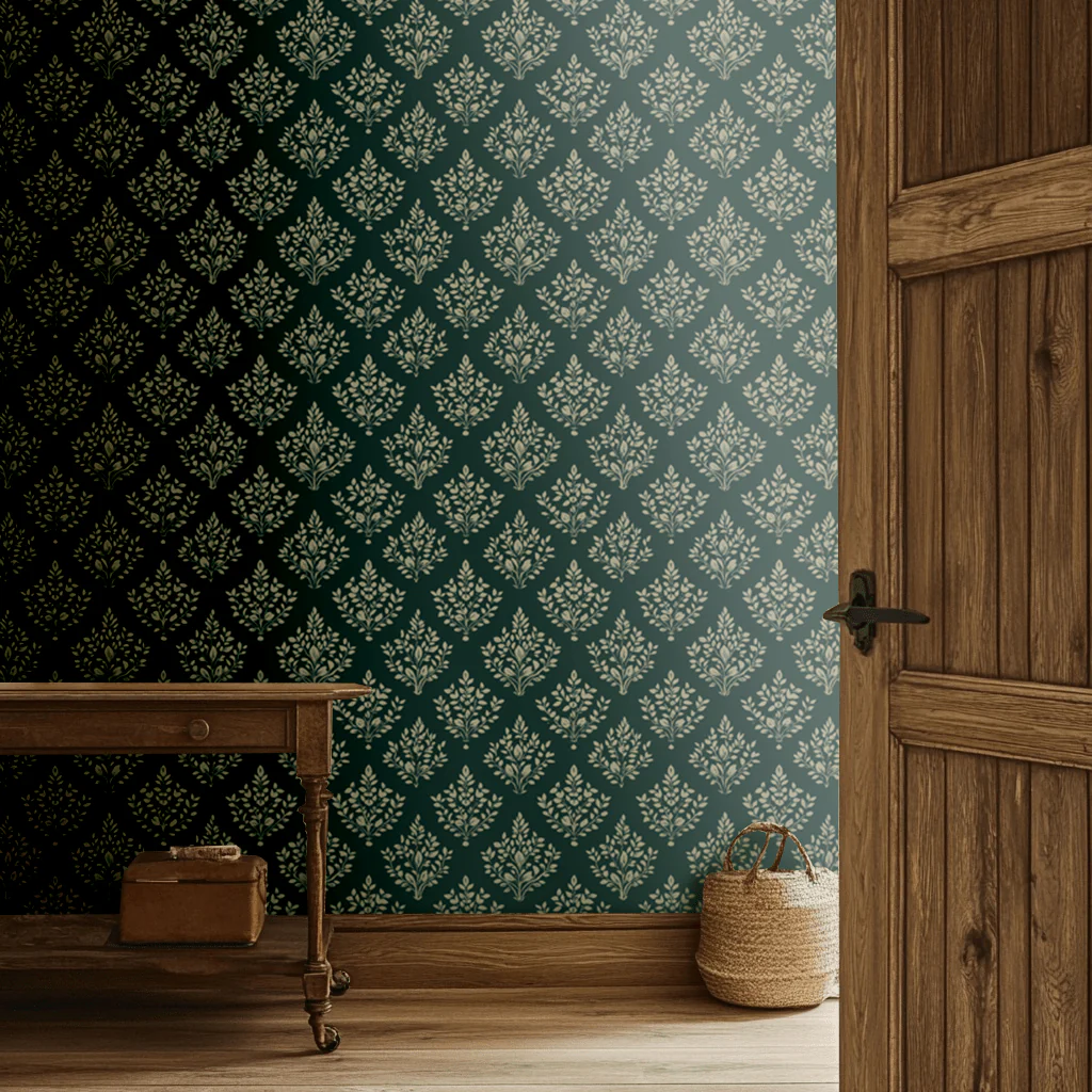 Ashton brings timeless charm with its hand-painted botanical motif in soft sage against a deep green backdrop. The balanced repeat and organic brushwork lend a refined, heritage-inspired look that feels equally at home in modern or traditional spaces.