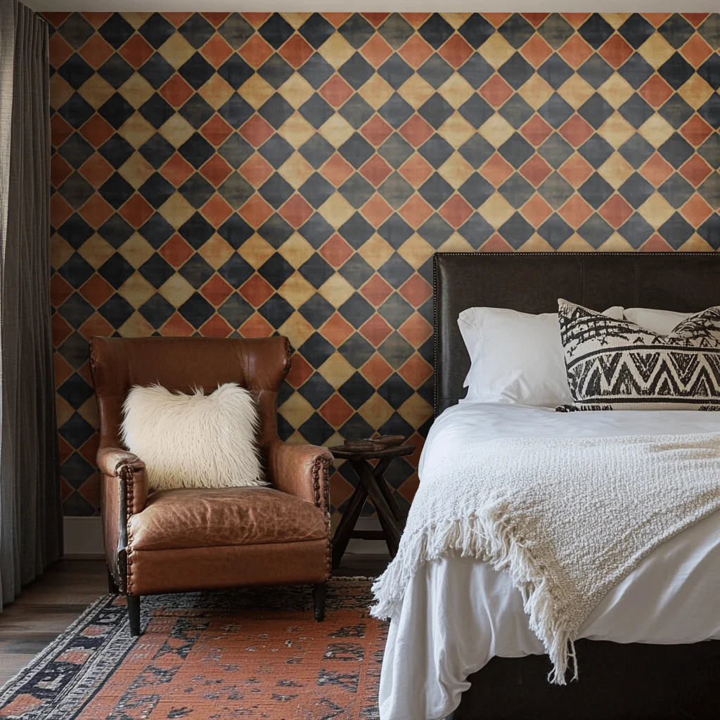 Belmont Check is a striking plaid-inspired wallpaper featuring painterly diamonds in deep navy, golden ochre, and rust. The hand-brushed texture gives the geometric pattern warmth and depth, balancing structure with artistry. Both classic and bold, Belmont Check adds richness and character to entryways, offices, and dining spaces alike.