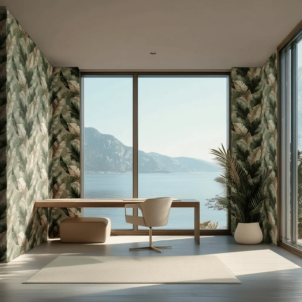 Transform your space with Suavo Wallpaper, featuring lush green and cream palm leaves that bring tropical botanical elegance to any room. This sophisticated design captures the serene beauty of nature, perfect for creating a calming, resort-inspired atmosphere in your home. The timeless botanical pattern works beautifully in bedrooms, living areas, or offices, adding depth and visual interest while maintaining a refined, professional aesthetic.