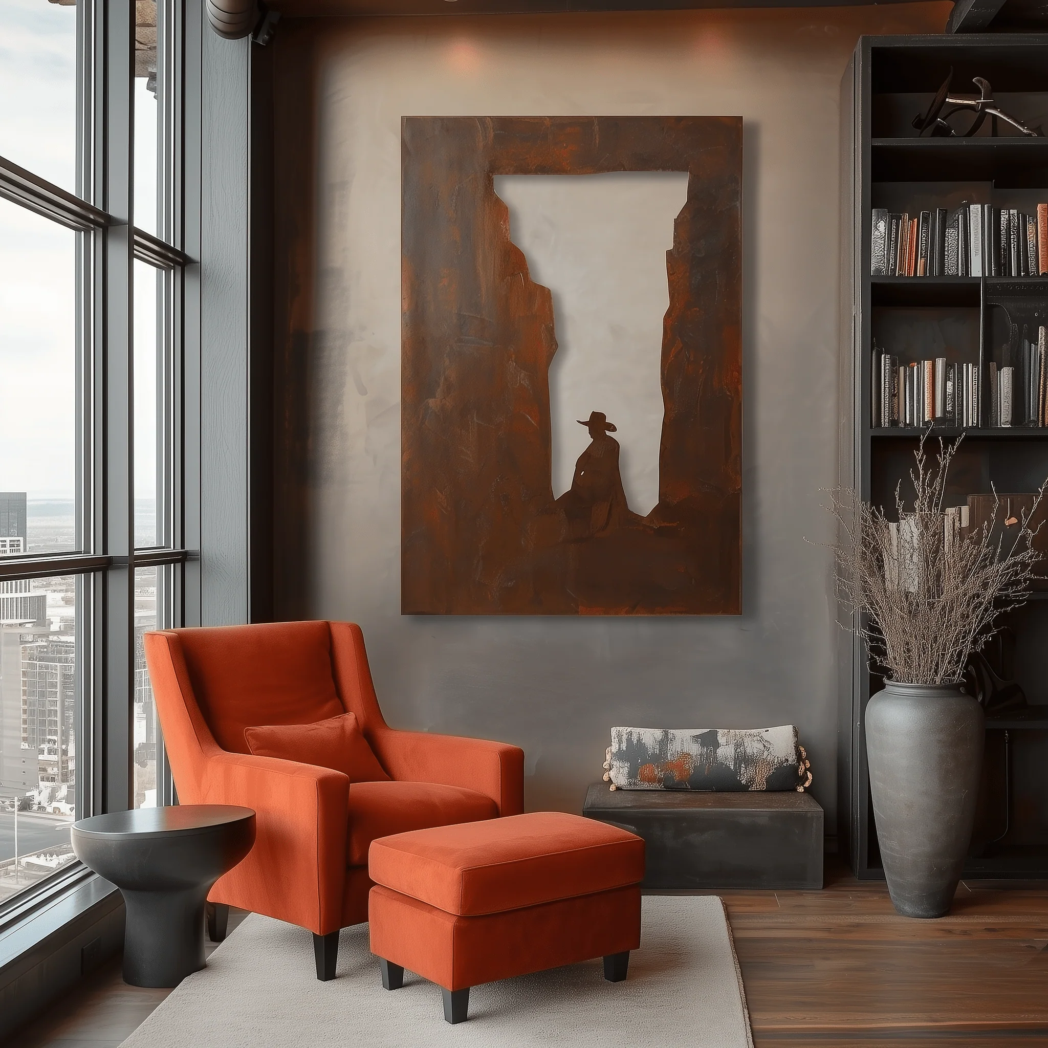 A lone rider sits framed by towering stone walls, carved in steel with a weathered patina. The negative space draws the eye upward, evoking the quiet stillness and scale of the Westâs great canyons.