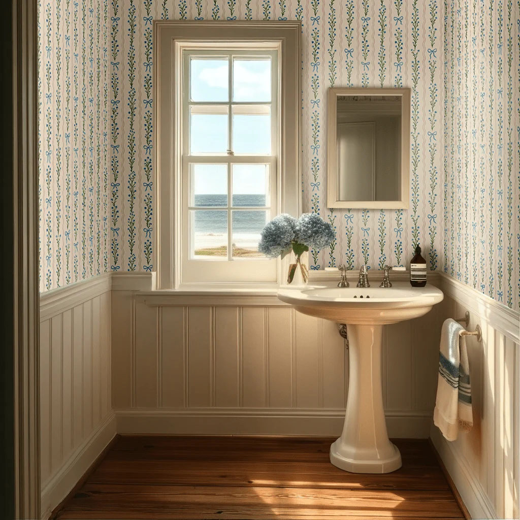 Winslow Wallpaper brings timeless elegance to any room with its delicate design featuring soft blue bows and charming florals nestled between classic stripes. The light, airy pattern creates a sophisticated yet welcoming atmosphere, perfect for bedrooms, nurseries, or living spaces seeking a touch of refined beauty. This wallpaper combines traditional charm with contemporary style, making it an ideal choice for those who appreciate understated luxury and graceful design details.